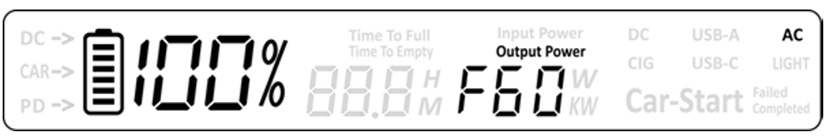 开启 AC 输出功能后,连续 3 击 AC 开关,屏幕显示对应的频率,2 秒后切换到功率显示界面,”F50”代表 50Hz,”F60”代表 60Hz,请根据当地电网或者电器需要选择(部分国家无法调整频率),关机后自动记忆上一次频率。如下显示: